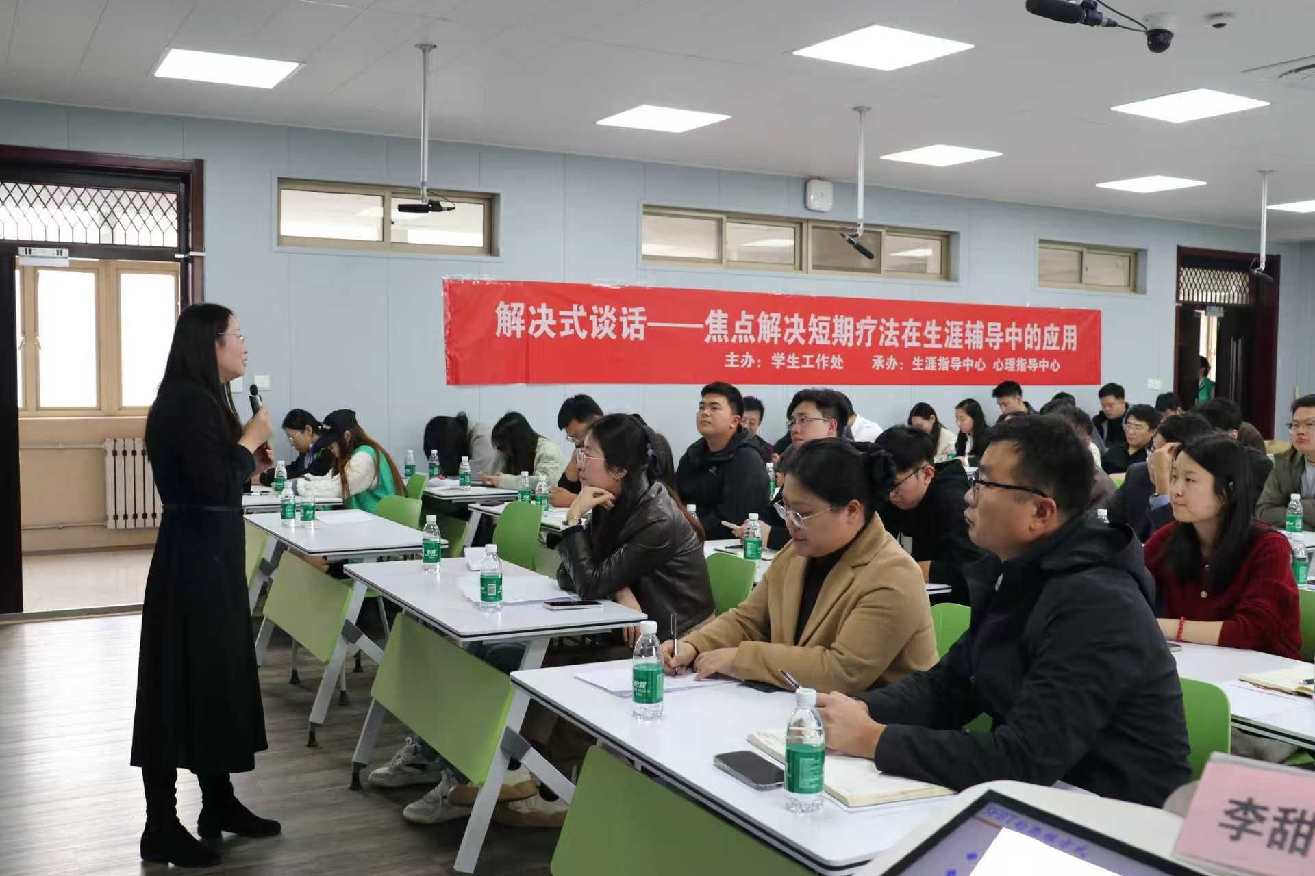 为进一步提升辅导员生涯辅导技能,提高生涯指导质量,10月29日,学校举办“解决式谈话——焦点解决短期疗法在生涯辅导中的应用”专题培训。培训由学生工作处主办,生涯指导中心、心理指导中心承办,邀请山东师范大学教育学部副教授、硕士生导师李甜甜做专题报告,学生工作处副处长张晶主持培训,各学院生涯辅导员、生涯发展指导工作室成员、近三年新进辅导员、心理专职教师等参加培训。
