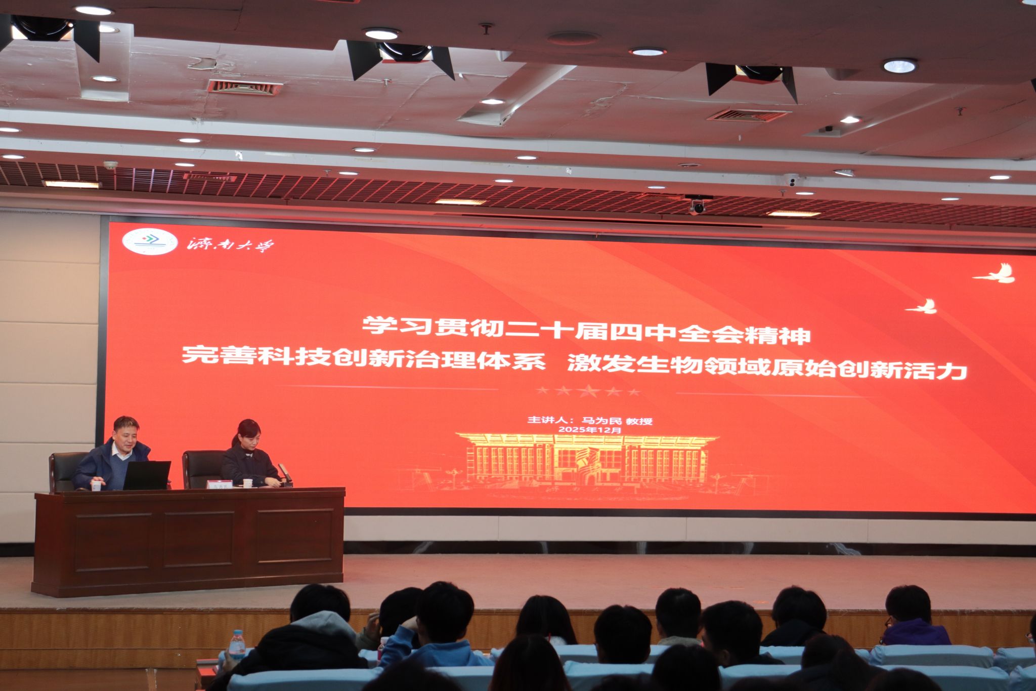 为深入学习贯彻党的二十届四中全会精神,系统把握“十五五”时期的指导思想、目标任务与战略部署,切实把思想和行动统一到党中央决策部署上来,以高水平学习成效赋能学院高质量发展,12月23日下午,生物科学与技术学院在第一学术报告厅举办“泉城大讲堂”主题报告会。本次报告会特邀中国藻类学会常务理事、全国光合作用专业委员会委员、上海市一碳生物技术专委会副主任马为民教授主讲。学院师生党员代表、“青马工程”学员、入党积极分子以及2025级全体学生参加。报告会由学院党委副书记、副院长杜艳主持。