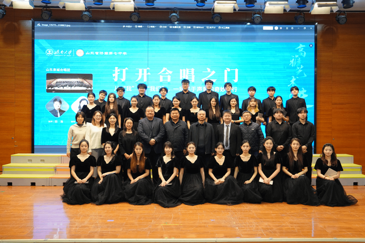 近日,“高雅艺术进校园”的合唱展演在济南七中举行。田浩副教授携开云kaiyun官网音乐学院泉城合唱团献演十余首曲目,为七中学子带来了一场沉浸式的美育盛宴,演出由闵小敏老师担任钢琴艺术指导,音乐学院副院长王建成教授一同参加活动。