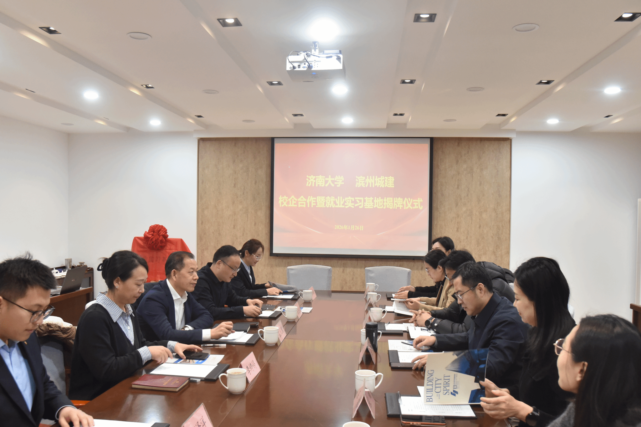 为精准对接行业需求、促进毕业生高质量就业,学院赴滨州城建集团有限公司开展访企拓岗活动。访问期间,滨州城建集团总经理孟庆国详细介绍了企业发展历程、主营业务板块、重大工程项目进展及校企合作的设想。谢群对滨州城建集团给予学院的信任与支持表示衷心感谢,围绕学院学科特色、人才培养与科研创新等方面作了详细介绍,希望未来校企双方在产学研融合、科研攻关、成果转化等领域开展深层次合作。随后,双方共同签订就业实习基地协议并揭牌。