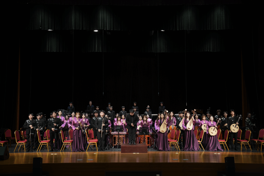 演出现场,《龙跃东方》的旋律一经奏响便点燃全场。乐曲以鼓为主,巧妙融合丰富民族器乐音色与《茉莉花》的经典旋律,曲风时而激昂澎湃如黄河奔涌,尽显中华民族的磅礴气势;时而婉转悠扬似泉水叮咚,传递传统民乐的细腻韵味。在田浩老师富有激情与感染力的指挥下,乐团成员与打击乐独奏者精准配合,用铿锵有力的鼓点呼应时代脉搏,以激昂动人的旋律勾勒出“巨龙昂首、东方崛起”的壮丽图景。展演还通过线上平台同步直播,直播间内观众纷纷发送弹幕,既赞赏乐团的精彩演出,也惊叹于传统民乐在当代焕发出的独特魅力。