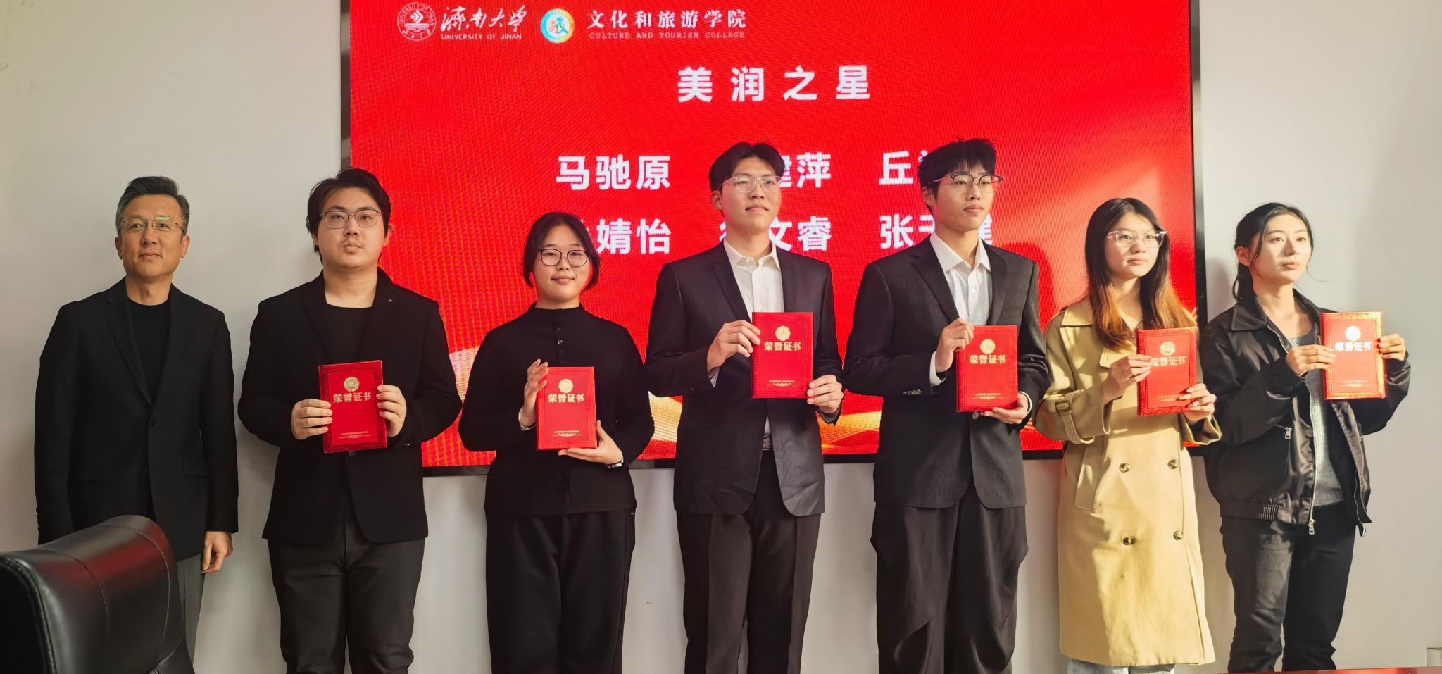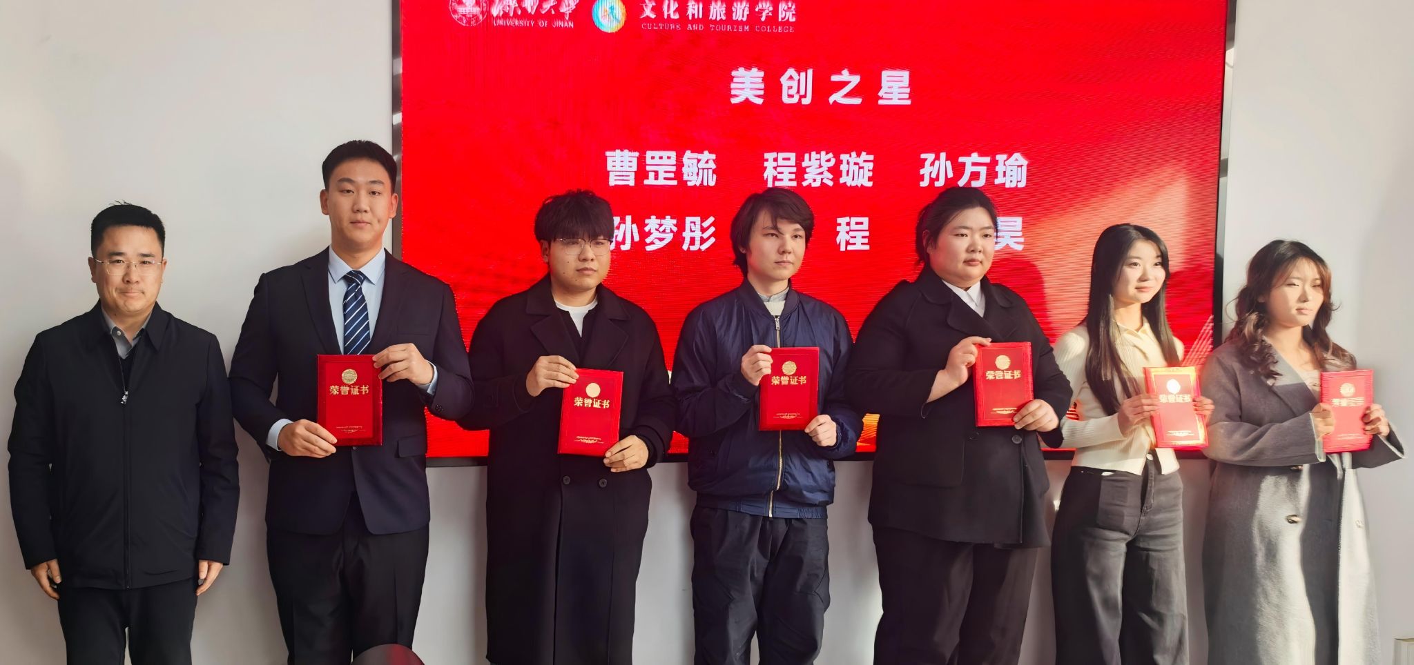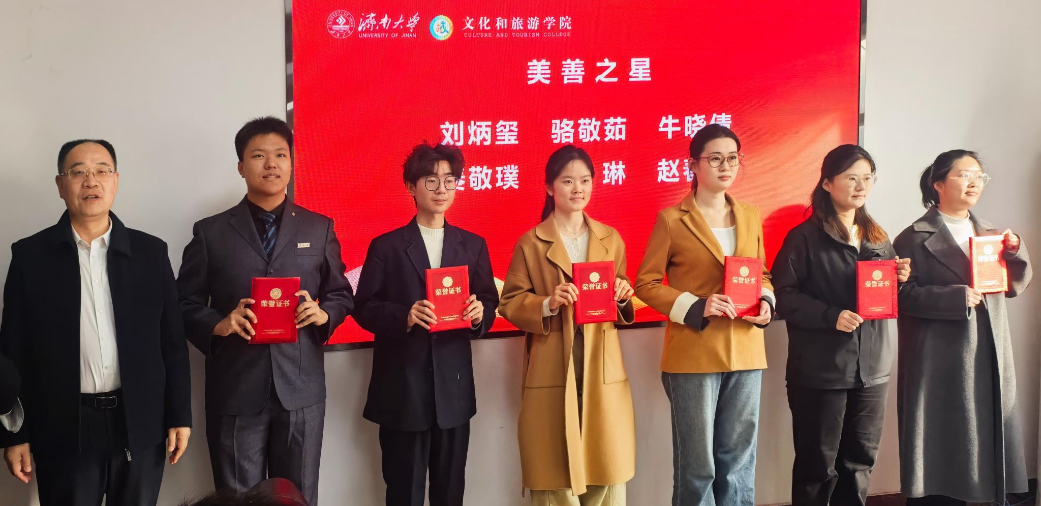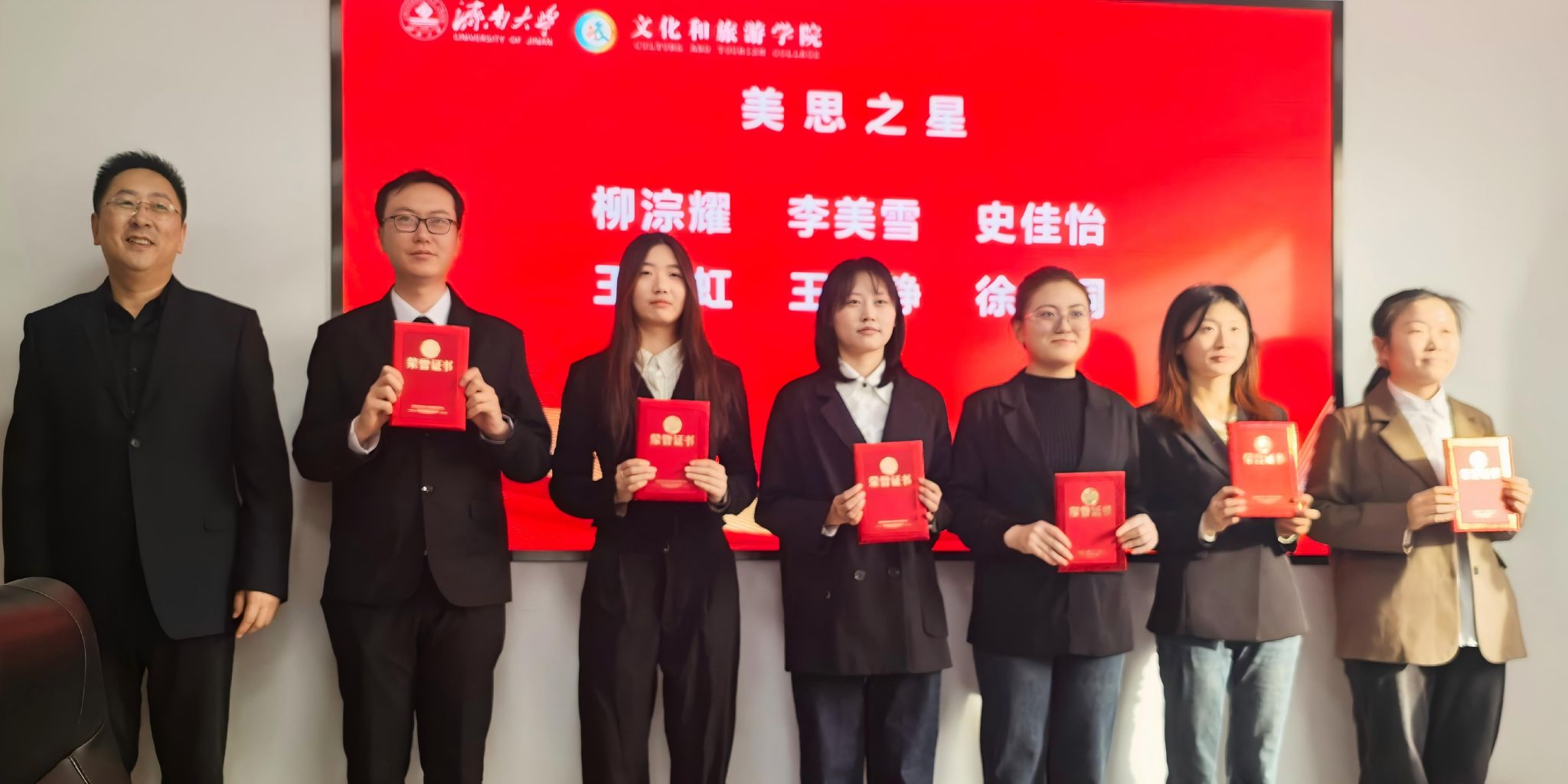 在随后进行的表彰仪式上,信苏珊宣读了《文化和旅游学院首届“四美之星”表彰决定》。学校党委常委、宣传部部长卢旺,学生工作处处长胡春毅,校团委书记李书翔,学院副院长马修伦分别为“美思之星”“美润之星”“美创之星”“美善之星”获奖学生代表颁奖。获奖学生代表刘炳玺同学上台发言,分享了其在美育熏陶下成长的心得体会,表达了对学校、学院培养的感激之情以及继续砥砺前行的决心。