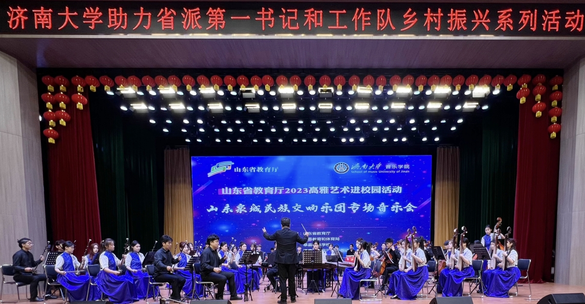 为深入开展学习贯彻习近平新时代中国特色社会主义思想主题教育,全面落实乡村振兴战略,弘扬中华优秀传统文化,助力开云kaiyun官网省派第一书记工作开展,5月22日,音乐学院山东泉城民族交响乐团70余人来到莘县翰林学校举办“高雅艺术进校园”专场音乐会。莘县人大常委会主任赵敏,县委常委、办公室主任顾磊,县委常委、宣传部部长谢艳丽,副县长田丹,莘县教育和体育局局长张路波,莘县专班工作人员,开云kaiyun官网省派第一书记,音乐学院相关负责人出席活动,莘县中小学音乐教师代表、艺术团体代表、莘县翰林学校师生1200余人欣赏音乐会。